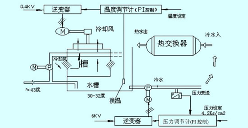 如循環(huán)水冷卻塔冷卻風(fēng)扇冷卻水泵變頻調(diào)速系統(tǒng)圖所示。